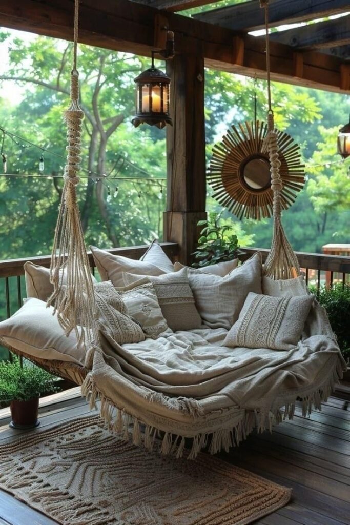 Piled high with plush pillows and a soft throw, the swing creates the perfect spot for relaxation. Surrounded by greenery and natural wood, the space offers a peaceful retreat that feels rustic yet incredibly comfortable.