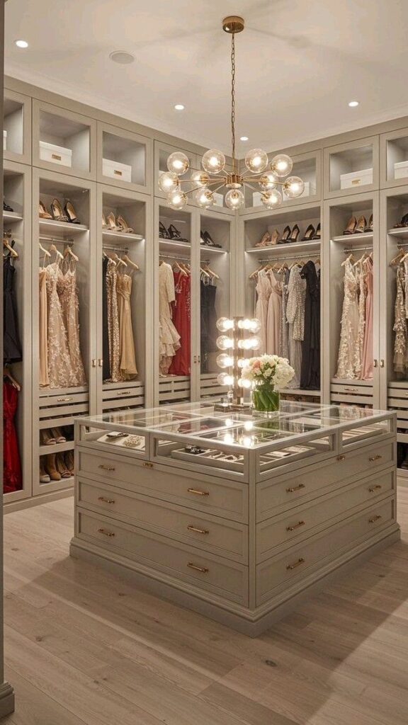 This walk-in closet is a dream come true. Its transparent doors allow you to display your clothes, and its illuminated shelves ensure that every piece stands out. The stylish, glass-topped island in the center of the room provides additional storage and can double as a makeup table. This closet is a luxurious addition to any home, offering both functionality and aesthetic appeal.