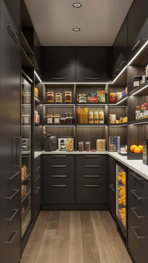 Dark-colored cabinets and shelves with integrated lighting make all items easily visible. Cabinets with transparent glass doors and a miniature refrigerator provide an aesthetically pleasing and practical solution.