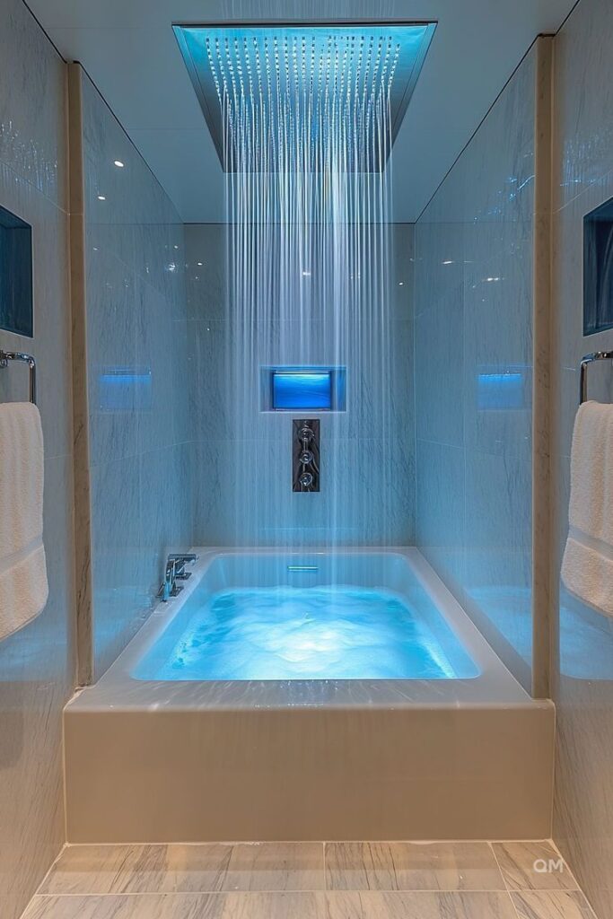 The large, square showerhead creates a waterfall effect, and the integrated blue lighting transforms the water into a calming, ethereal cascade. The clean, bright space created by the minimalist white bathtub and marble-look tiles makes the color-changing light a captivating focal point.