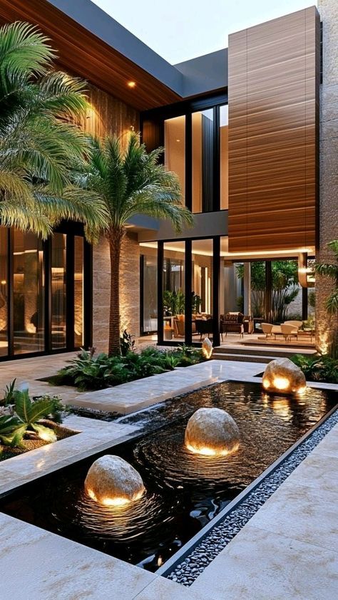 The stunning exterior of this building showcases a breathtaking blend of modern architecture and natural elements. The building’s clean lines are softened by lush greenery, including tall palm trees and various other plants. The central water feature with illuminated smooth rocks creates a tranquil, visually captivating focal point. Large glass windows and doors blur the line between indoor and outdoor living, transforming this courtyard into a serene and luxurious retreat.