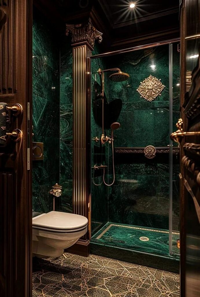 The deep emerald green marble walls, accented with intricate gold patterns, create a regal and dramatic atmosphere. The classic wooden door and ornate columns add timeless elegance, and the modern shower and floor lighting blend old-world charm with contemporary functionality.
