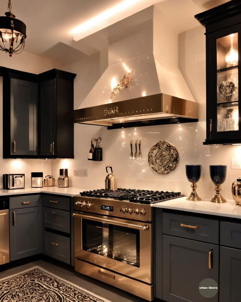 This kitchen is like a modern work of art, with black cabinets, gold accents, and a marble backsplash. The gold range hood and stove are the focal point, adding striking elegance. Lighting highlights the countertop and decorative objects, adding depth to the space. This design is ideal for those who embrace a bold, luxurious style.