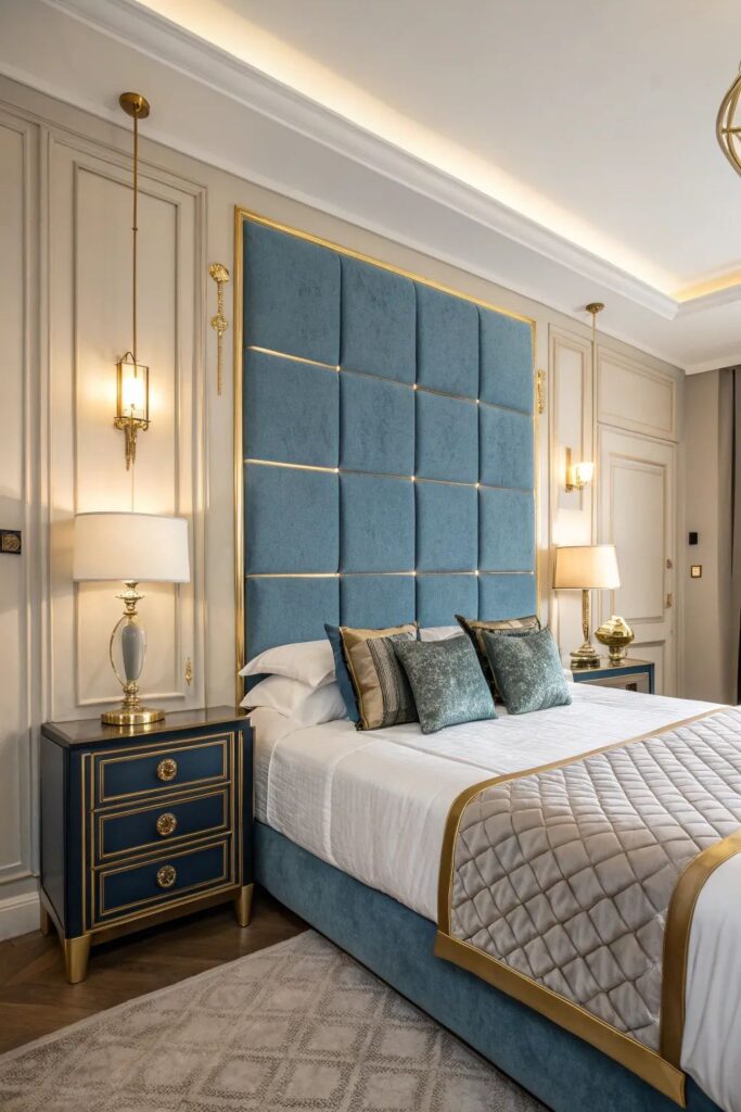 This bedroom exudes sophistication with its navy blue and gold color scheme. The wide, quilted, navy blue headboard serves as the room’s focal point, and the gold-detailed side tables and pendant lamps add a touch of classic elegance.
