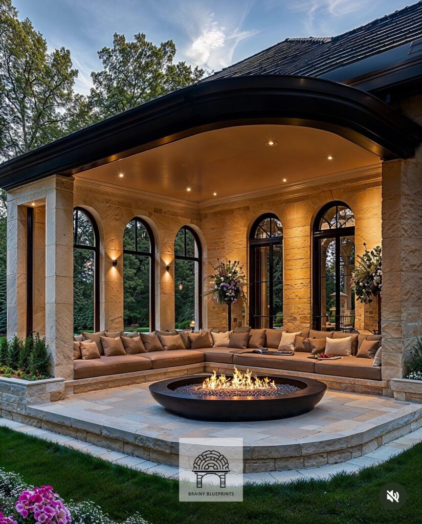 This outdoor seating area is both comfortable and stylish. The stone arch structure is reminiscent of Mediterranean architecture, and the large, U-shaped seating area with cushions is perfect for entertaining guests. The modern fire pit in the center creates a cozy atmosphere on cold evenings.