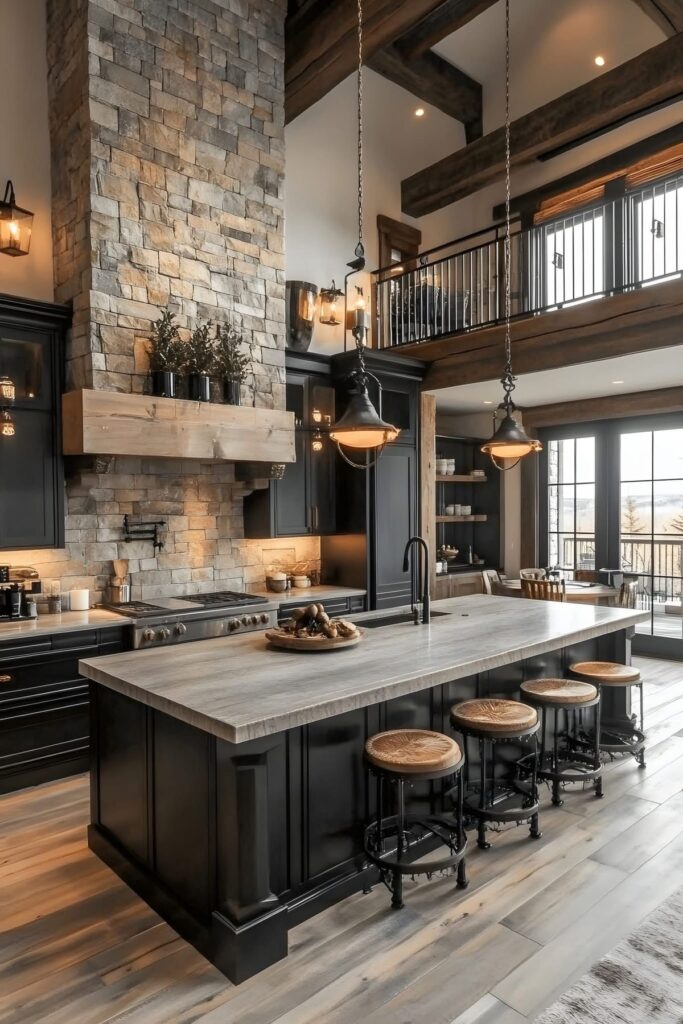 This kitchen mixes rustic and industrial styles to create a spacious, loft-like atmosphere with high ceilings. The most striking feature is the natural stone wall and hood that extends from floor to ceiling. The stone details make the space look strong and unique. Black matte cabinets and exposed wooden ceiling beams balance modern and rustic elements. The light-colored countertop on the kitchen island makes the space brighter by balancing out the darker tones. The place has a rustic look, with metal chandeliers and bar stools covered in leather. This kitchen has a design that’s perfect for people who like natural textures and big spaces.