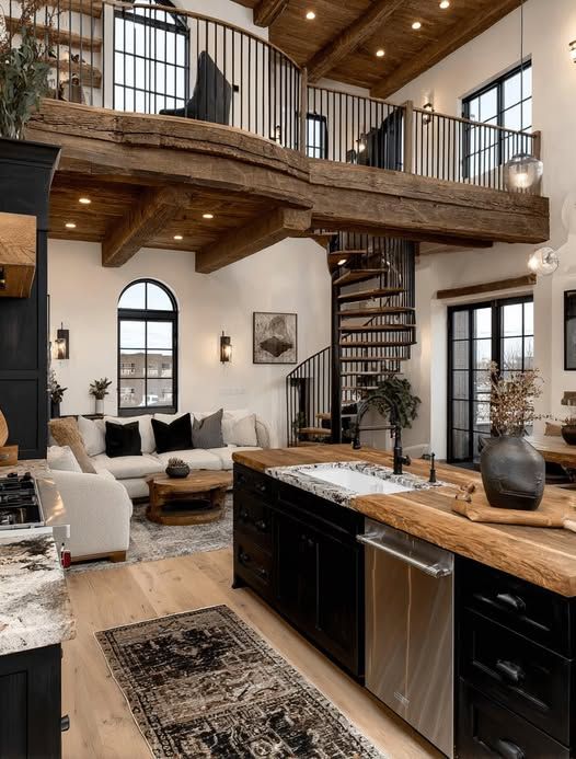 This kitchen has a unique design that mixes rustic and modern styles. The high ceilings and large wooden beams make the space feel warm and spacious. The black kitchen island and wooden countertop have a modern look, and the spiral staircase and balcony details match the home’s overall architecture, creating a unique atmosphere. One of the most striking features of the space is the living area, which combines a fireplace and large windows. This open floor plan makes the kitchen a place where people can gather. The mix of wood and black metal details makes the space both welcoming and elegant.