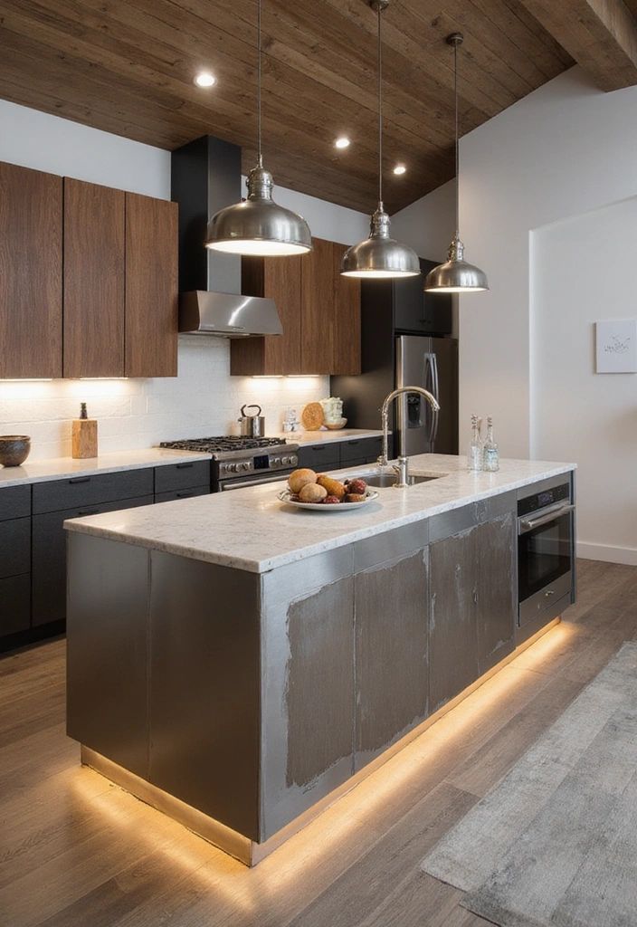 This kitchen combines industrial and natural styles. The cabinets are walnut-colored and the base cabinets are metallic gray. This gives the space a modern and warm texture. The kitchen island has an industrial look because of its metal surface that has been “distressed,” which means it’s been made to look old and worn. The warm LED light that comes from below makes the island look less harsh. The wooden ceiling and metal chandeliers go well with the overall look of the space. The white ceramic tiles, similar to those found in metro stations, balance the dark tones of the wood and metal, creating a sense of openness. This kitchen is a great example of combining different materials to create a unique design.