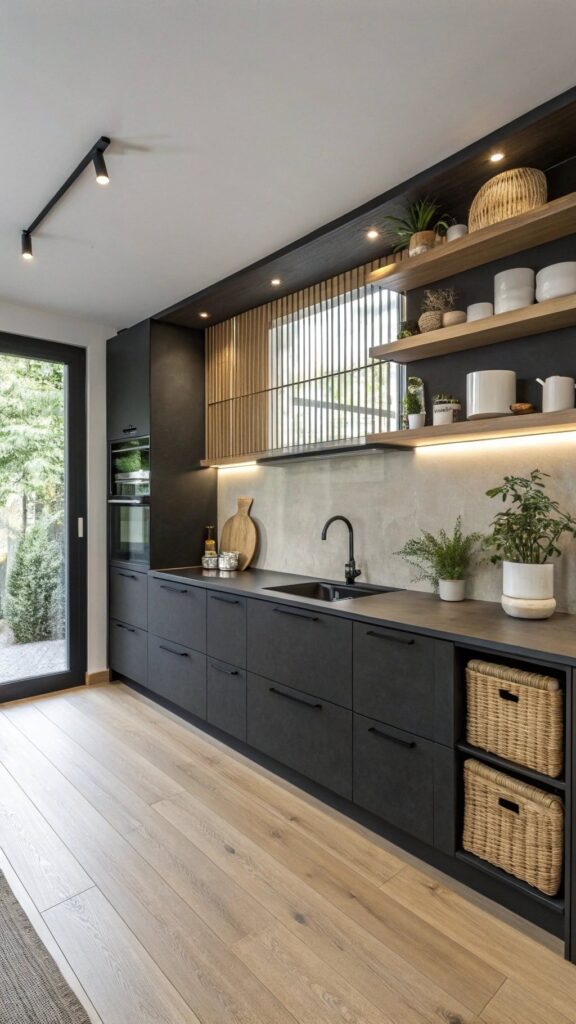 This kitchen is special because it has a simple and practical design. The cabinets and countertops are matte black, which makes the space look modern and simple. The wood details on the open shelves make the design feel warm and add character. LED lighting under the shelves lights up the workspaces and makes the decorative plants and objects stand out. The floor is finished with light-colored wood flooring that goes well with the kitchen cabinets. The storage area created with closed baskets looks good and is useful. This kitchen is a great choice for people who like simple and practical designs.