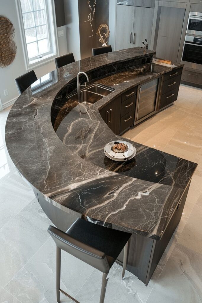 16) Fluid Lines and Dark Marble: A Modern and Artistic Kitchen