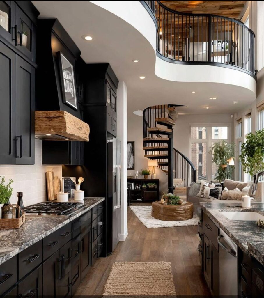 This kitchen is like a modern loft apartment. Black cabinets and countertops make the space look strong and modern. The granite countertop on the kitchen island matches the wooden floor. The kitchen is open and connected to the main living area. The home’s high ceilings, large windows, and spiral staircase that connects the floors give it a unique look. The log-like wooden detail used in the kitchen hood adds a warm, natural touch to this modern design. This kitchen is perfect for people who want a place that’s both functional and social.