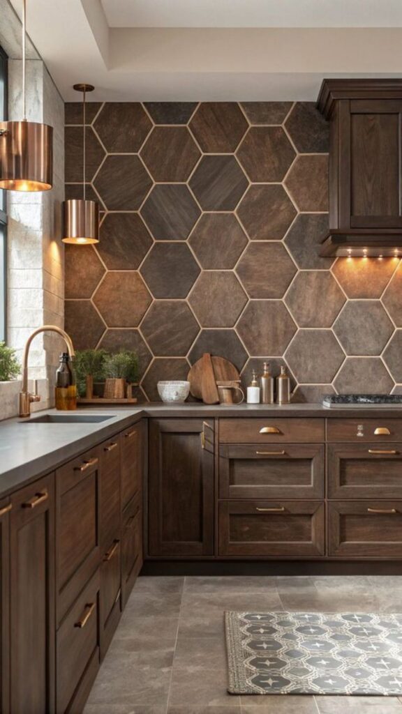 This kitchen is welcoming and modern. It combines natural textures and warm colors. Dark wood cabinets and bronze-colored handles make the space feel rich. The kitchen wall has large hexagonal tiles that make the design look more geometric. The tiles also have a natural stone texture that gives the room a rustic feel. The kitchen has copper-colored chandeliers and faucets that make it look warm and elegant. This kitchen is a great example of a modern and attractive design that uses natural materials.