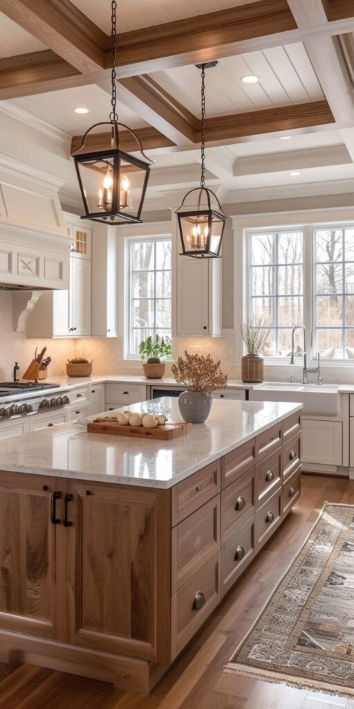 This kitchen mixes simple, country-style design with a modern touch. The wood details on the ceiling and kitchen island make the space feel warm and welcoming. The white cabinets and countertops make the place look bright and airy. The space’s most striking feature is the modern, industrial-style black metal chandeliers. These chandeliers contrast with the kitchen’s overall white and wood tones, creating a striking focal point. The dark metal handles and white background offer a nice blend of classic and modern styles. This kitchen is a great choice for people who want a warm and welcoming space.