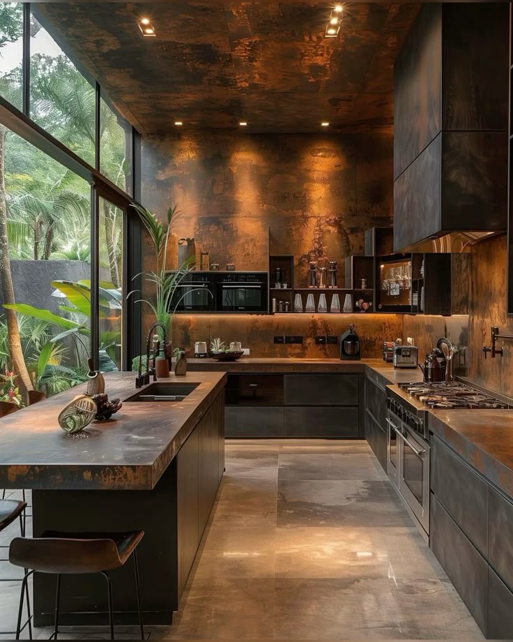 This kitchen combines industrial and rustic styles. The weathered, rusted metal panels on the walls and ceiling give the space a strong and unusual character. The kitchen island and cabinets give the room an industrial look. The kitchen has large glass windows that let in a lot of natural light and connect it to the tropical plants outside. LED strip lighting under the counter makes the space feel warm. Black faucets and simple appliances give the space a modern look. This kitchen is a great example of a unique and bold design.