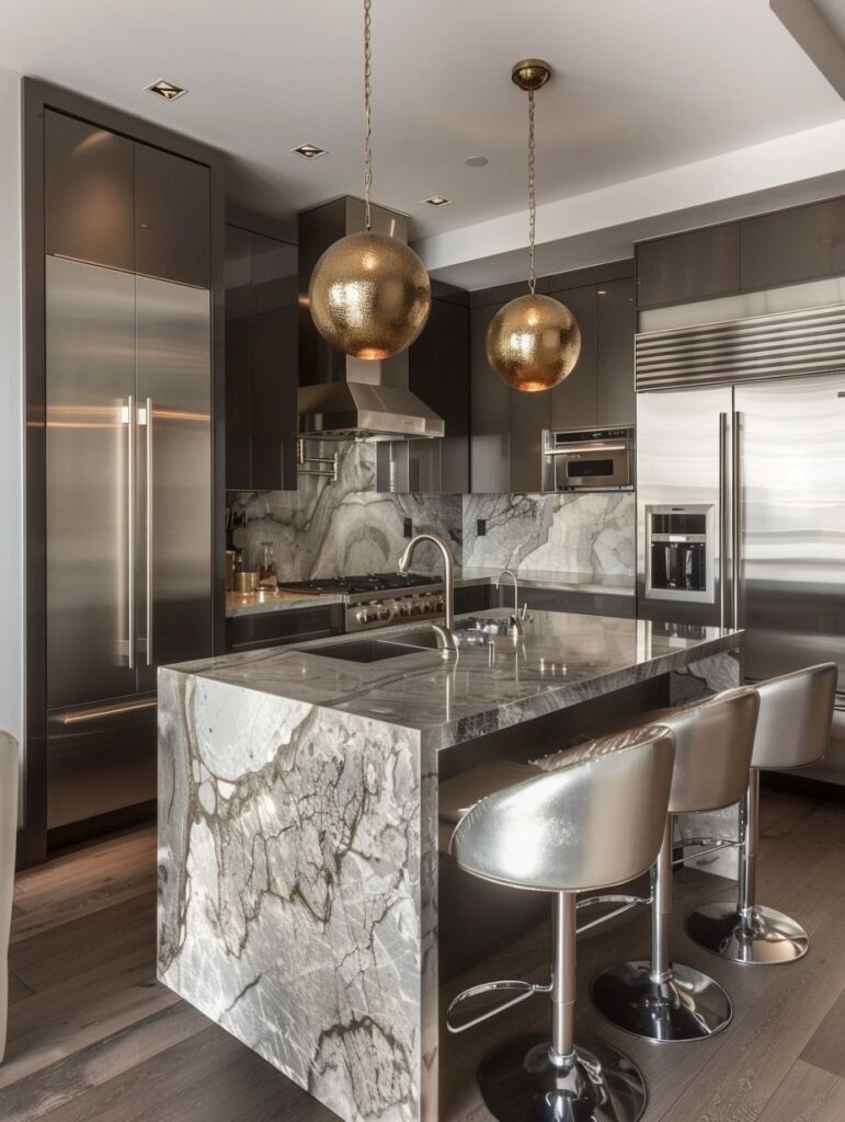 This kitchen is modern and luxurious. The shiny gray cabinets and stainless steel appliances make the space look futuristic. The kitchen’s most striking feature is its dramatic marble-patterned island and countertops. The marble’s natural veins add a artistic touch to the space. Gold-colored, shiny chandeliers and bar stools make the space feel warm and grand, and they perfectly match the gray tones. This kitchen is perfect for anyone who wants a beautiful and practical space.
