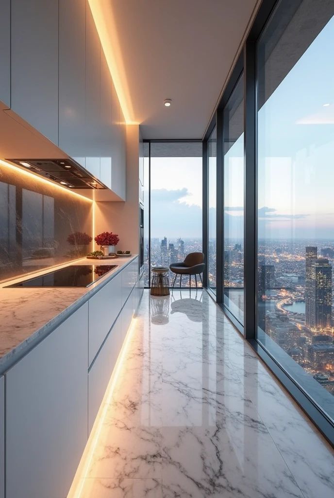 This kitchen has a simple, modern design and a great view of the city. The space feels airy and bright, with white and gray tones, and the kitchen seems to merge with the outdoors thanks to the floor-to-ceiling glass walls. Marble patterns on the floor and countertops make the design look more sophisticated. The cabinets have a simple, clean look. They are made with straight lines. The warm LED lights hidden under the cabinets and in the ceiling make the space feel welcoming, especially in the evenings. This kitchen is perfect for people who love minimalism and city living.