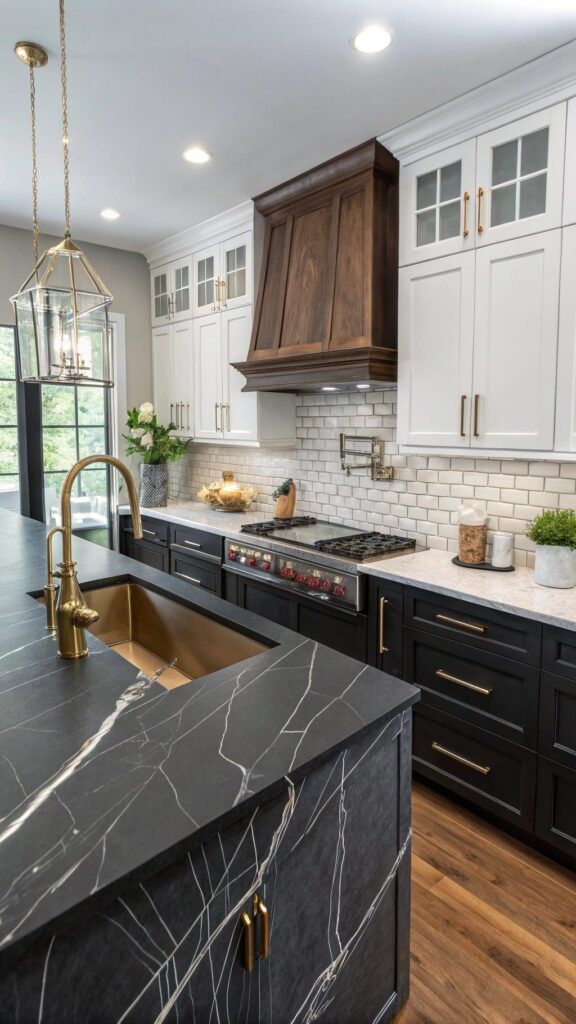 This kitchen mixes classic and modern styles to create a timeless look. Black base cabinets and white wall cabinets create contrast and add depth to the space. The black marble countertop on the kitchen island looks luxurious with its gold veins, and the gold faucet and handles make the design shine. The wooden hood adds a warm and rustic touch to the kitchen’s modern look. White metro tiles and large windows make the space bright and airy. This kitchen is a great example of a classic and modern style.