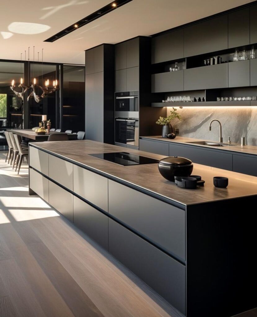 This kitchen is all about the power and elegance of black, from the countertops to the ceiling. The cabinets and countertops are matte black, which makes the space look modern and minimalist. The kitchen island is a great place to work and spend time with family. It has a lot of space and a modern look. The black is offset by the warm LED lighting on the light-colored wooden floors and countertops. Open shelves and decorative objects make the kitchen look more full.