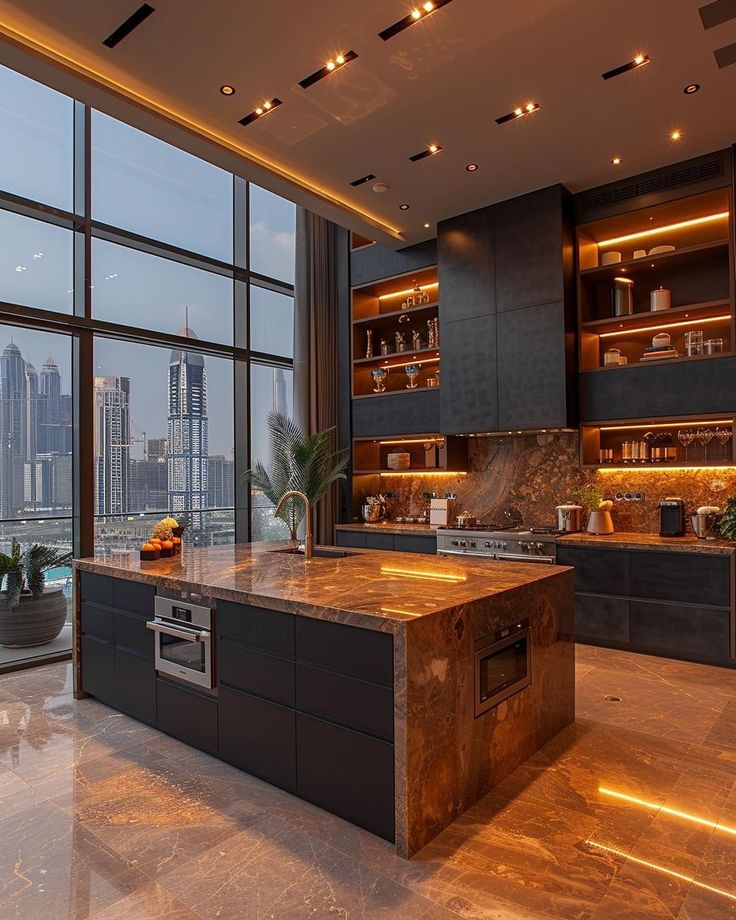 This kitchen is amazing. You can see the whole city through the big windows. The kitchen island and countertops are covered with marble that has a dramatic pattern, which makes the space feel luxurious. The dark surfaces of the lower cabinets make the marble look even more elegant. The hidden lights in the ceiling and shelves make the space feel warm and inviting, especially at night when you can see the city lights. This kitchen is a perfect place for people who love modern city life and fancy details.
