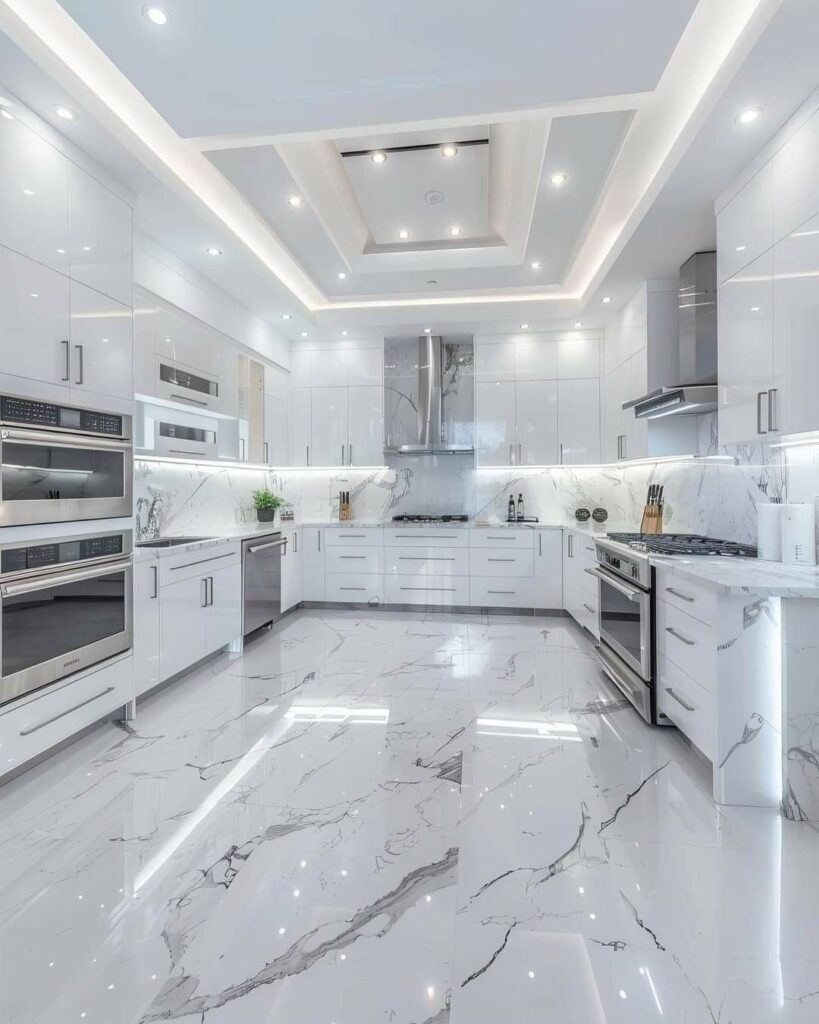 This kitchen is bright and airy. It is mostly white. Marble-patterned floors and countertops add art to the space, while white glossy cabinets provide a modern and clean look. The stainless steel appliances in the kitchen match the white surfaces. One of the most important details in the kitchen is the ceiling lighting and LED strips. The lights on the high ceilings and under the cabinets make the space look bigger and brighter.