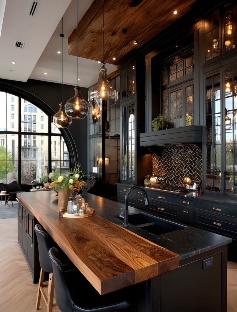 This kitchen is a great example for those who want to create a dark and sophisticated atmosphere. Black cabinets and countertops make the space look modern and bold. The natural wood countertop on the kitchen island balances out the dark tones and adds a warm touch. The wood countertop has a unique grain that makes the kitchen stand out. Glass-fronted cabinets and decorative lighting make the space look deeper and more elegant. The herringbone-patterned ceramics on the walls and the wide arched window blend industrial and modern lines to create an impressive result.