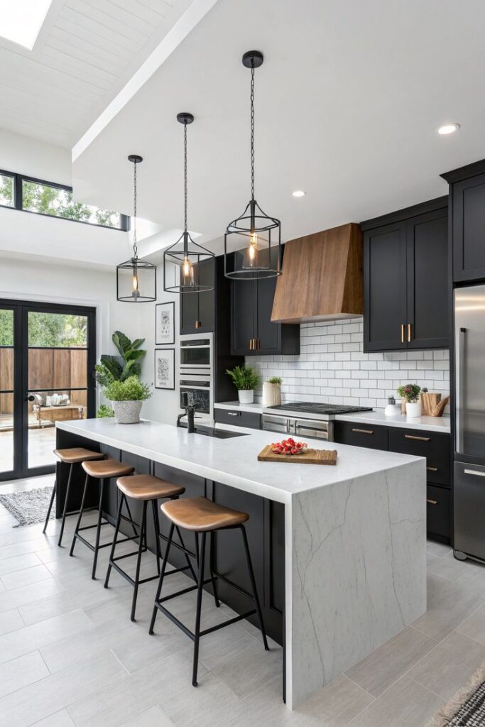 4) Modern Farmhouse Style: Black Cabinets and Wood Details