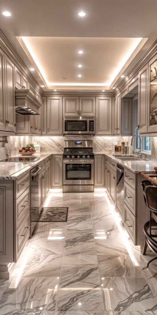 This kitchen shows how good lighting design can be. The gray cabinets and marble-look countertops create a stylish and timeless atmosphere. The LED strip lighting that comes from the upper and lower cabinets and under the countertops is the real star of the kitchen. These lights are more than just for looks; they also make the kitchen more functional. The cabinet and countertop lighting makes the work area more efficient. Stainless steel appliances match the modern design, and the warm lighting throughout the kitchen creates a welcoming environment.