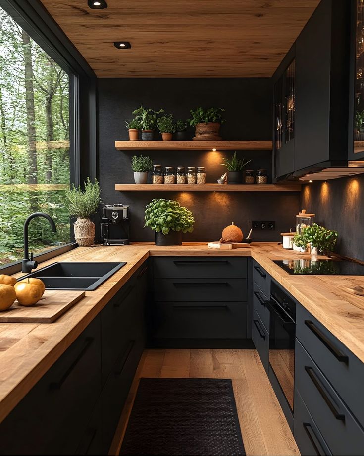 This kitchen has a simple design, and it matches the natural surroundings. The kitchen’s biggest highlights are the natural light and the view of the trees through the large window. The black matte cabinets and walls make the space look modern, while the wooden details on the countertop and open shelves make it look warm and natural. The wood used in this kitchen makes the space feel more personal and welcoming. The simple decor and plants on the open shelves offer a basic look. This design is perfect for people who want a calm and peaceful kitchen away from the noise of the city.