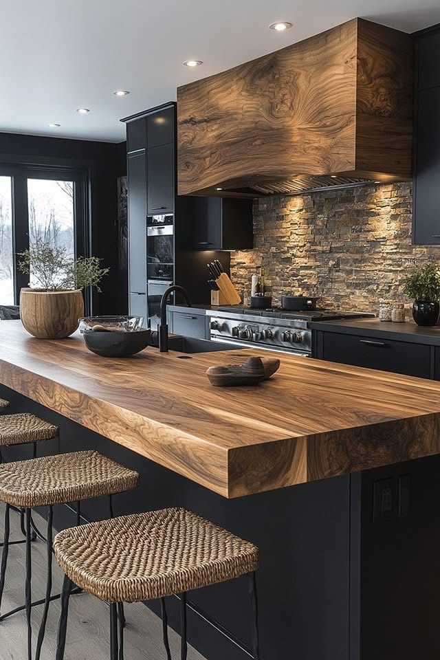 This kitchen has a modern look, with a mix of black and wood. Black cabinets and countertops make the space look strong and sophisticated, while the natural wood countertop on the kitchen island adds a warm, natural texture. The wooden details used in the hood stand out in the kitchen. The brick-patterned backsplash and woven-textured bar stools blend industrial and natural elements, making the design more interesting. This kitchen is a great example of bold colors and natural materials.