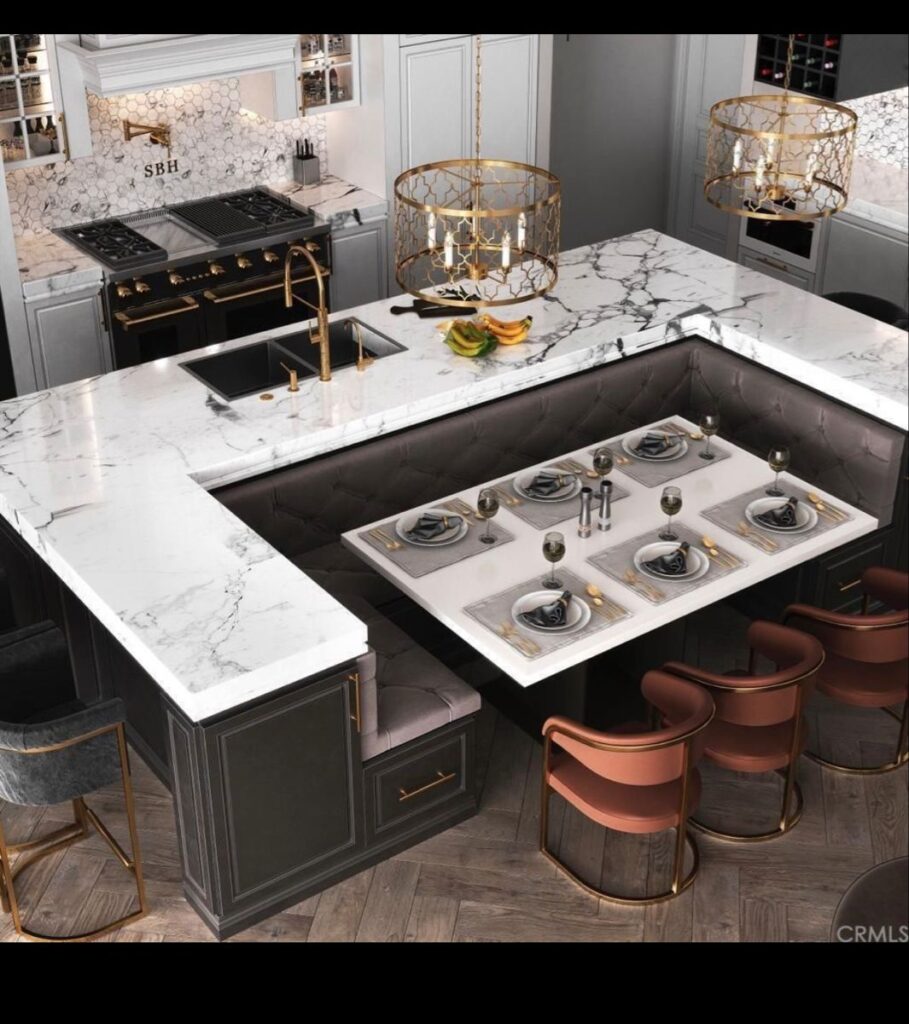 This kitchen combines modern and luxurious details to create an inviting dining area. White marble countertops make the kitchen look bigger and more elegant, while matte black cabinets create a stylish contrast. The most striking feature of this kitchen is the corner bench that combines the seating and dining areas, along with custom-designed lighting. The gold chandeliers and chair legs make the space look bright and luxurious. The herringbone-patterned wooden floor and marble countertop give this area a modern classic feel. This design is a great example for anyone looking to create a stylish and functional kitchen.