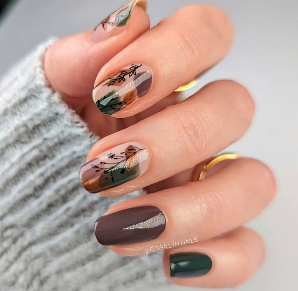 Here’s a manicure that embodies “sweater weather”! This design, where earth tones, khaki green, and calm beige converge, resembles a canvas. The abstract brushstrokes on some nails, along with the delicate black leaf patterns etched onto them, give this manicure an artistic, melancholic vibe. This warm, autumn-inspired design looks fantastic on short, square nails.