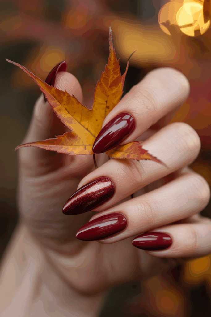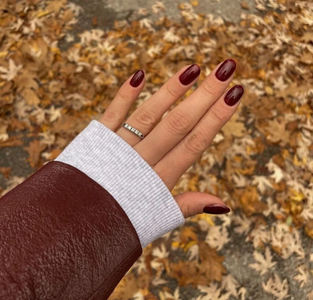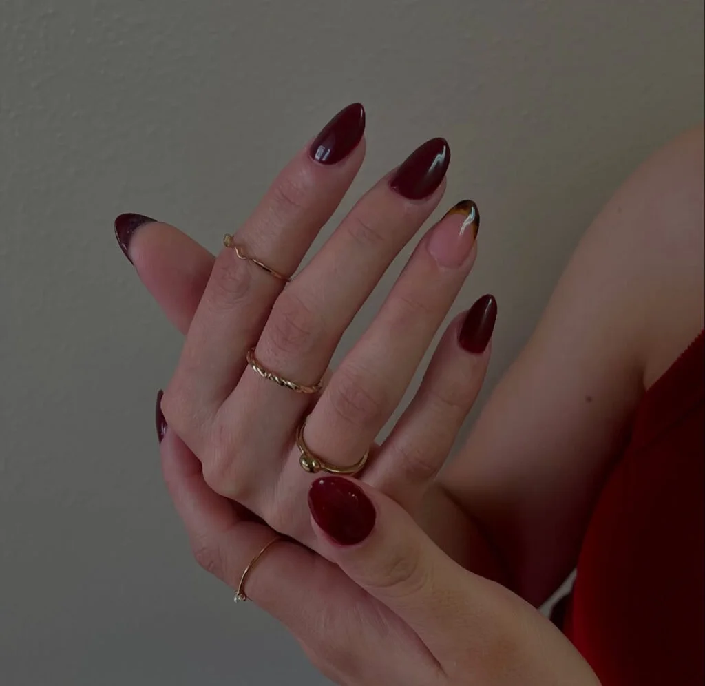 A deep, glossy wine red is an elegant and timeless choice. However, this manicure takes the classic to the next level. While most of the nail is covered in this rich color, the “negative space” detail on the ring finger and the subtle hint of autumn colors at the nail’s tip add a modern, sophisticated touch to the design. It looks stunning with gold rings.