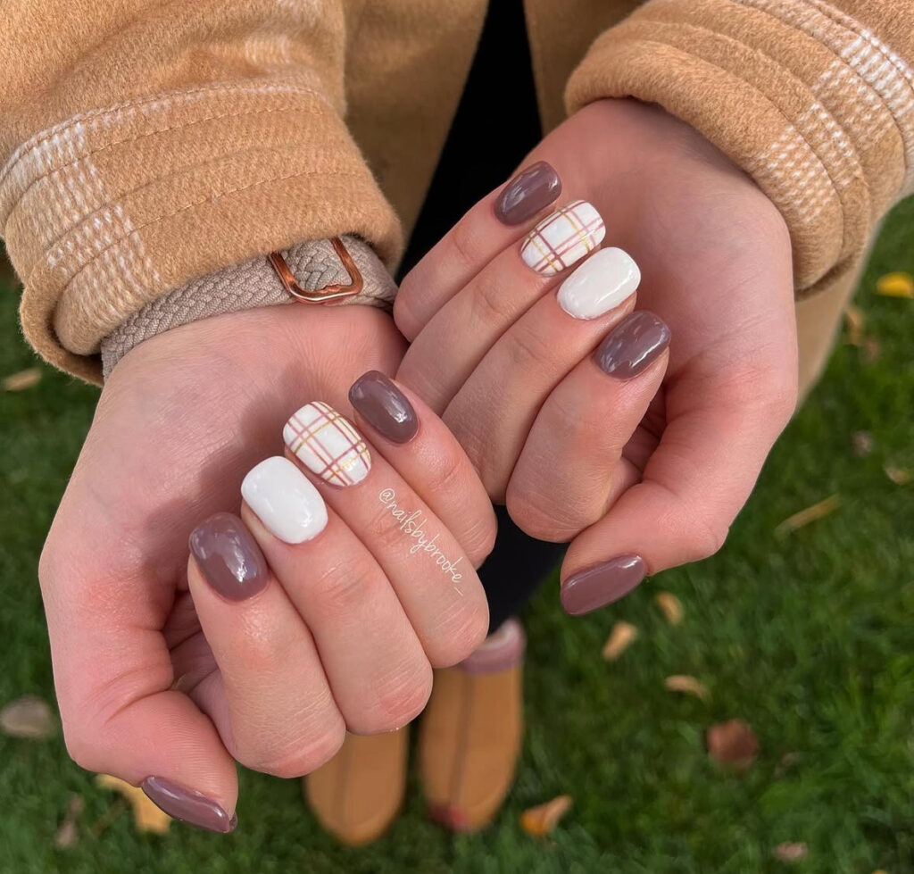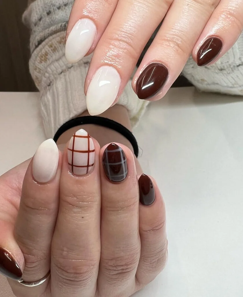 The perfect harmony of milk and black coffee! Rich, glossy chocolate brown and soft, broken white tones. A checkered pattern is created by contrasting these two colors on the nails: brown lines on white and white lines on brown. This contrast brings a modern yet classic balance to the manicure.