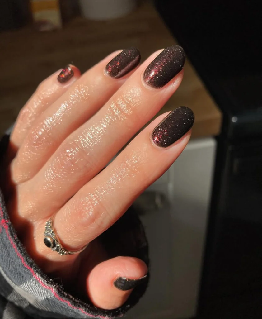 Bu tırnaklar tek kelimeyle lüks! “Kadife tırnak” (velvet nails) trendinin en güzel örneklerinden biri. Işığın vurduğu açıyla renk değiştiren, derin bir bordo-kahve tonu… Tıpkı pahalı bir kadife kumaşın dokusunu andırıyor. Bu manikür, özellikle kış aylarında, triko kazaklarla veya şık gece elbiseleriyle muhteşem bir doku kontrastı yaratacaktır. Zengin ve sofistike.