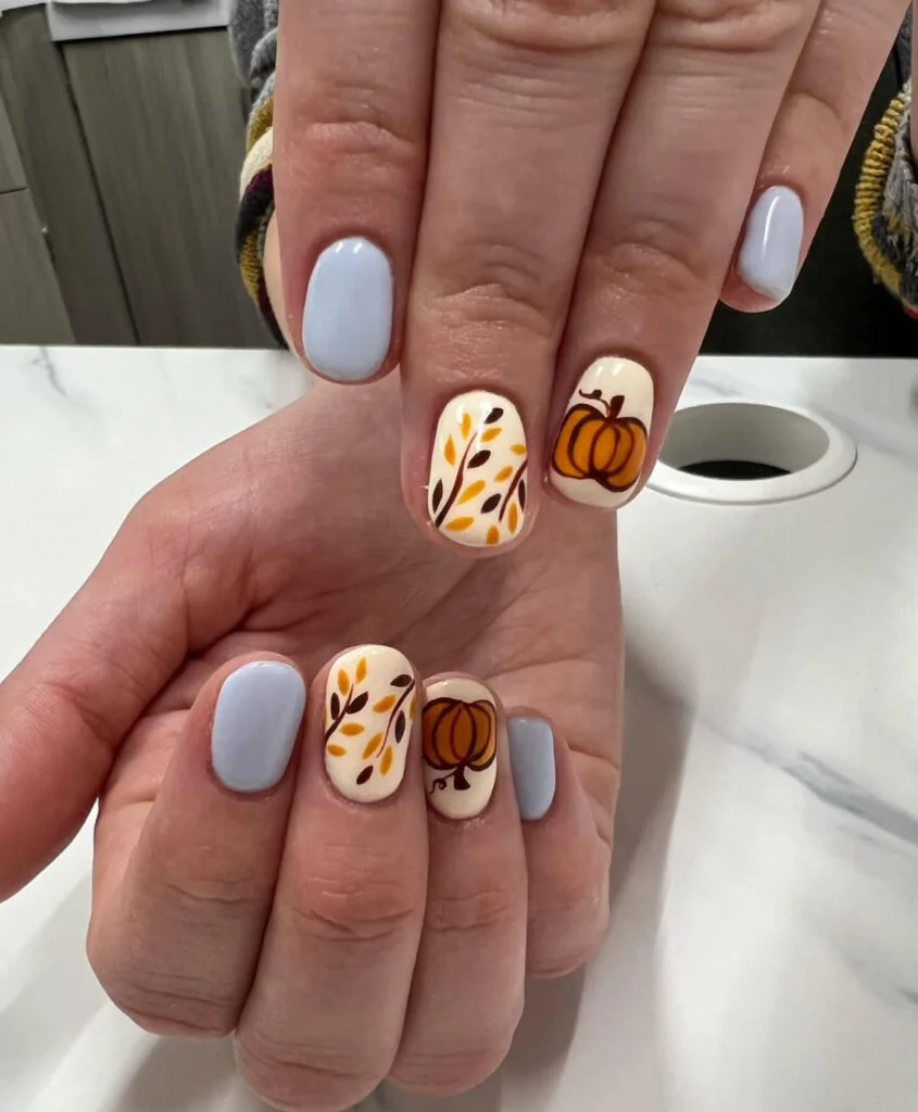 Here’s a design that breaks the fall color clichés! It combines baby blue, creamy beige, and classic pumpkin orange—colors that aren’t typically associated with fall. This unexpected color palette gives the manicure a fresh, cheerful vibe. The designs look amazingly cute and clear, even on short nails. The hand-drawn leaves and pumpkin details create the perfect “sweet autumn” theme.