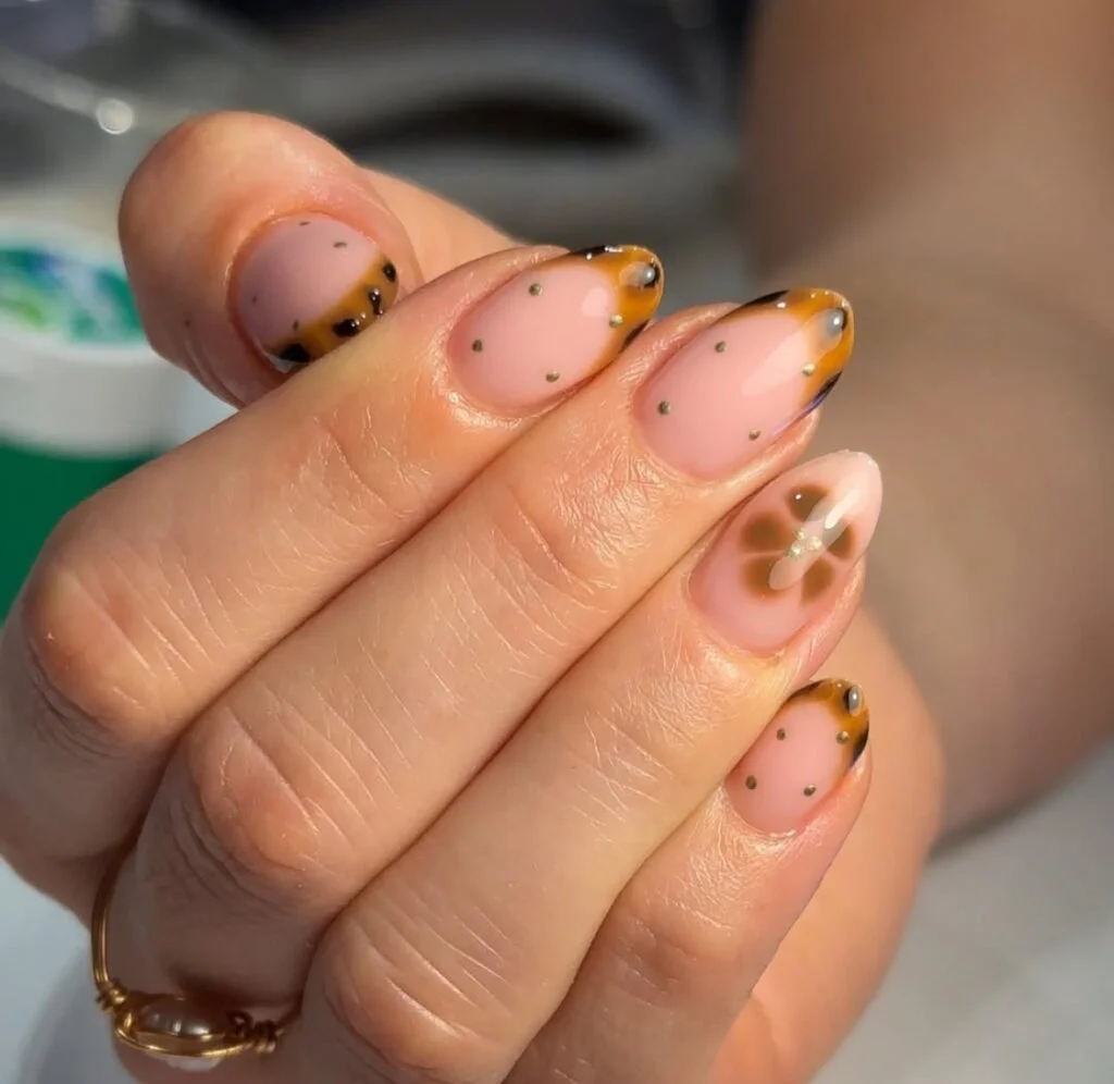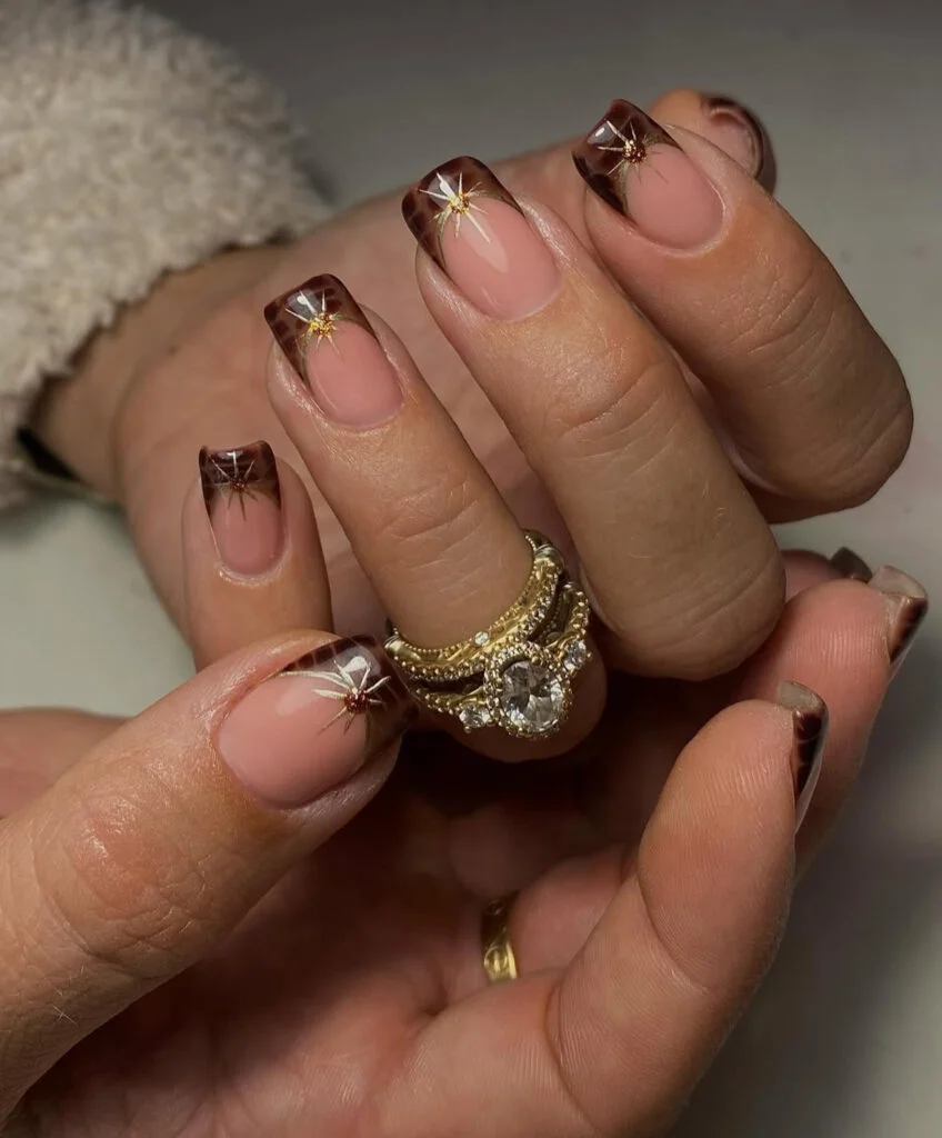 This is an incredibly chic and modern take on the classic French manicure! Instead of the traditional white line at the nail tips, a deep “tortoiseshell” pattern in dark brown tones has been used. A tiny gold “star” sparkle at the beginning of the pattern takes the design to a whole new level. These nails look regal, bold, and sophisticated.