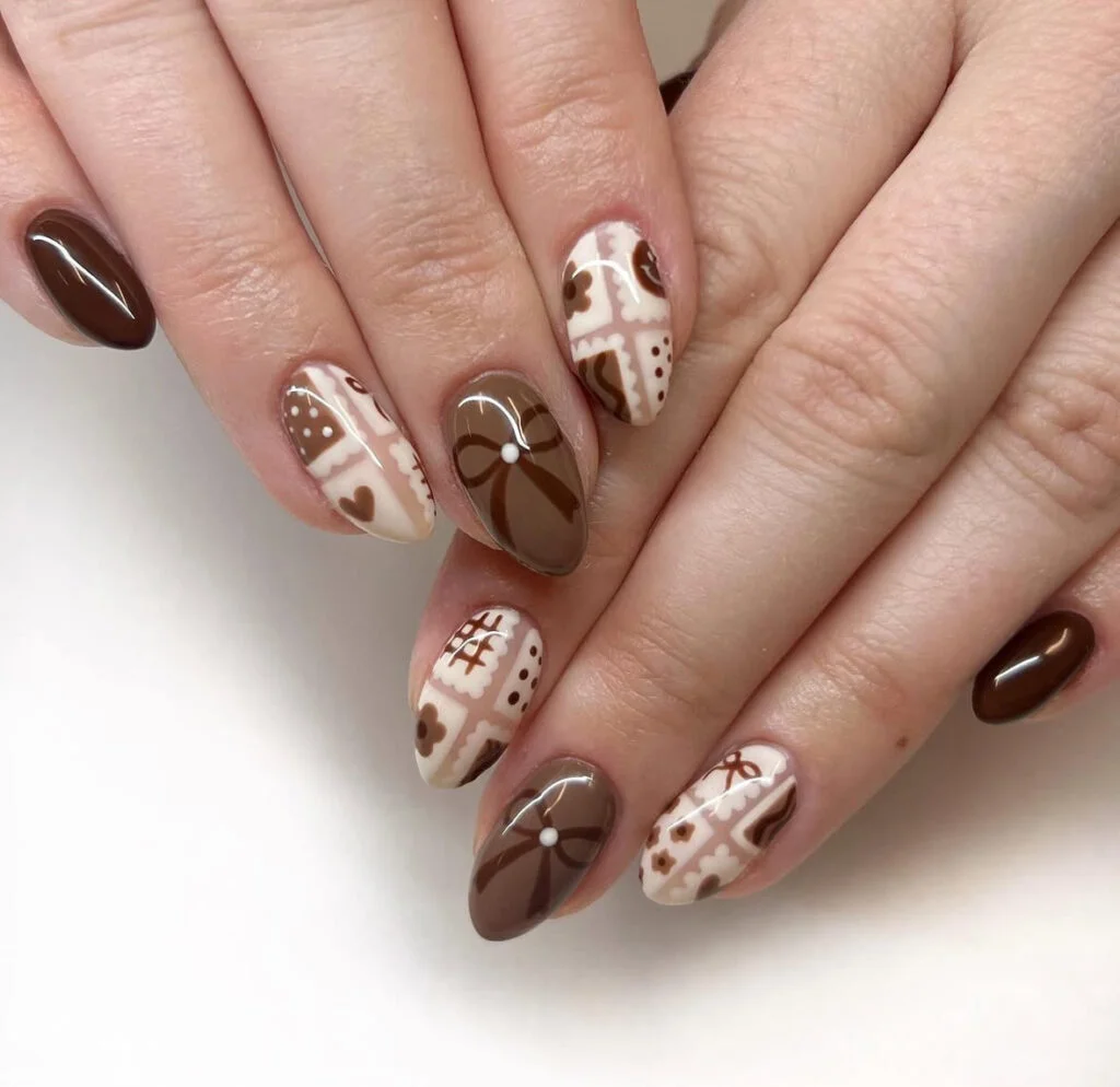 These nails bring joy just by looking at them! They look like they just popped out of a luxury chocolate box. The shiny, dark brown nails are adorned with tiny hearts, bows, and checkered patterns that perfectly complement the creamy base. The bow detail is especially wonderful, with its intricate craftsmanship and almost 3D appearance. They’re sweet, cute, and very appetizing!