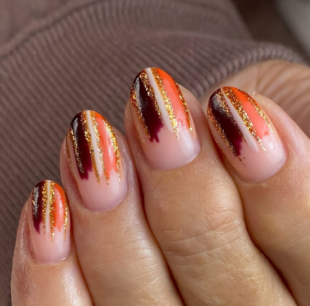 These nails truly capture the essence of an autumn sunset! They feature burgundy, vibrant orange, and peach tones brushed vertically onto a neutral pink base. Gold glitter lines filtering through these fiery colors add dazzling sparkle and movement to the design. The result is a highly energetic, dynamic, and artistic piece.
