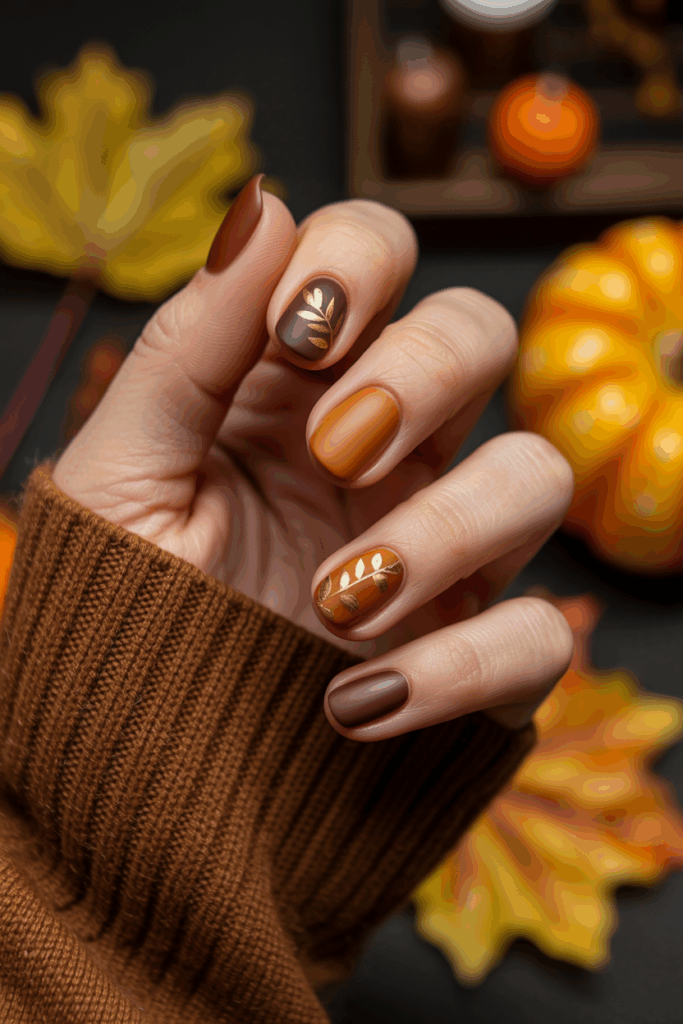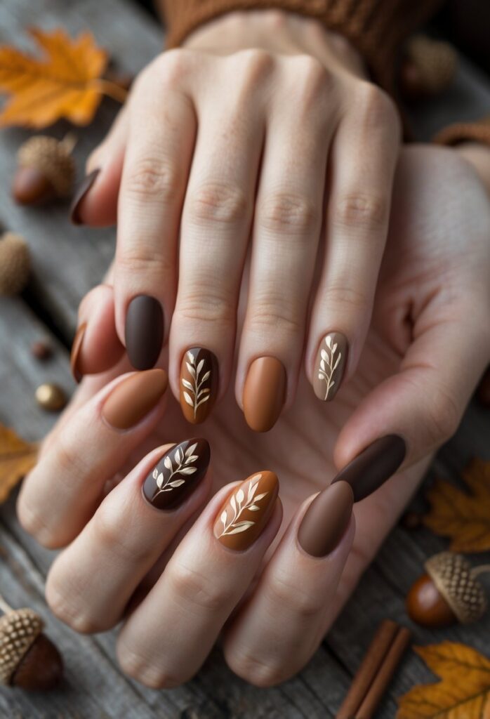 All the colors of coffee come together in these nails! This “Skittles” application of matte espresso, latte, and caramel tones is very warm and harmonious. Delicate, cream-colored leaf patterns, which look as if drawn by hand, adorn the accent nails and add an artistic, bohemian touch to the design. It’s a true autumn aesthetic.