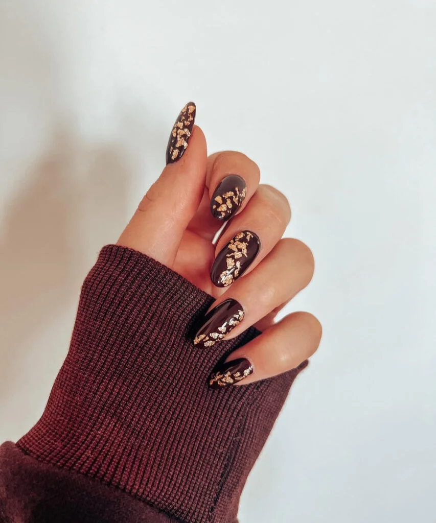 This look epitomizes “bold” and “luxurious”! Gold leaf pieces scattered irregularly over a deep coffee or burgundy base create an incredibly sophisticated vibe. The long, almond-shaped nail form makes this design even more elegant. It’s the perfect choice for a special occasion, chic dinner party, or any time you want to feel like royalty.