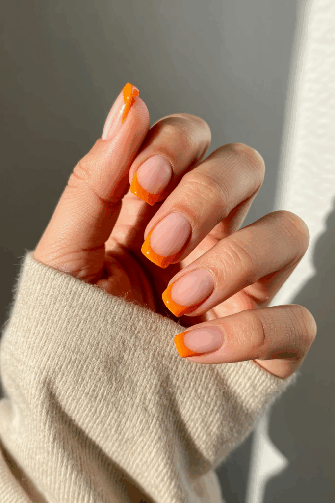 Here’s a groundbreaking, energetic design! Instead of the classic thin French manicure, this “deep French” style completely covers the nail tip. Combined with vibrant neon orange, it creates an incredibly modern and striking look. It contrasts wonderfully with neutral-colored sweaters — a minimalist yet bold choice.