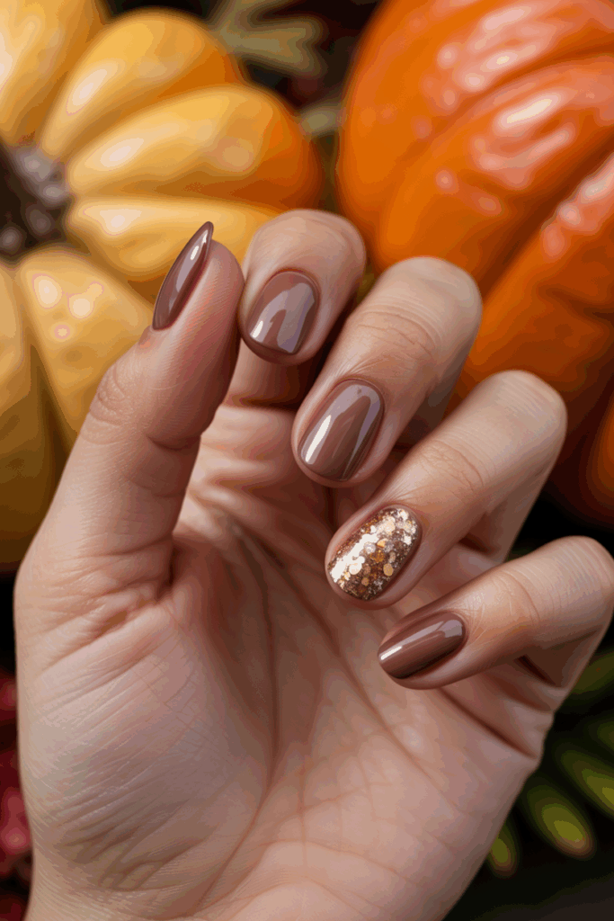 Here’s a true “hot chocolate and blanket” moment! This bright, warm coffee tone, reminiscent of milk chocolate, is wonderful on its own. But the accent on the ring finger… This “glitter bomb” detail, with its combination of large rose gold and champagne-colored glitter particles, instantly transforms a simple manicure into a festive look. It looks chic and fun on short nails, too!