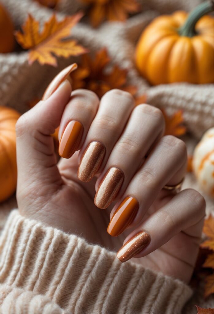 Here’s a full-on “Pumpkin Spice Latte” manicure! It features a vibrant, bright pumpkin/cinnamon orange paired with a metallic, shimmery version of the same shade. This “Skittles” manicure strikes a wonderful balance by mixing bright, shimmery textures. It’s a design that evokes all the warm, energetic, and beautiful things that come to mind when you think of autumn.