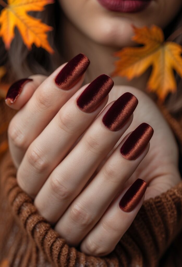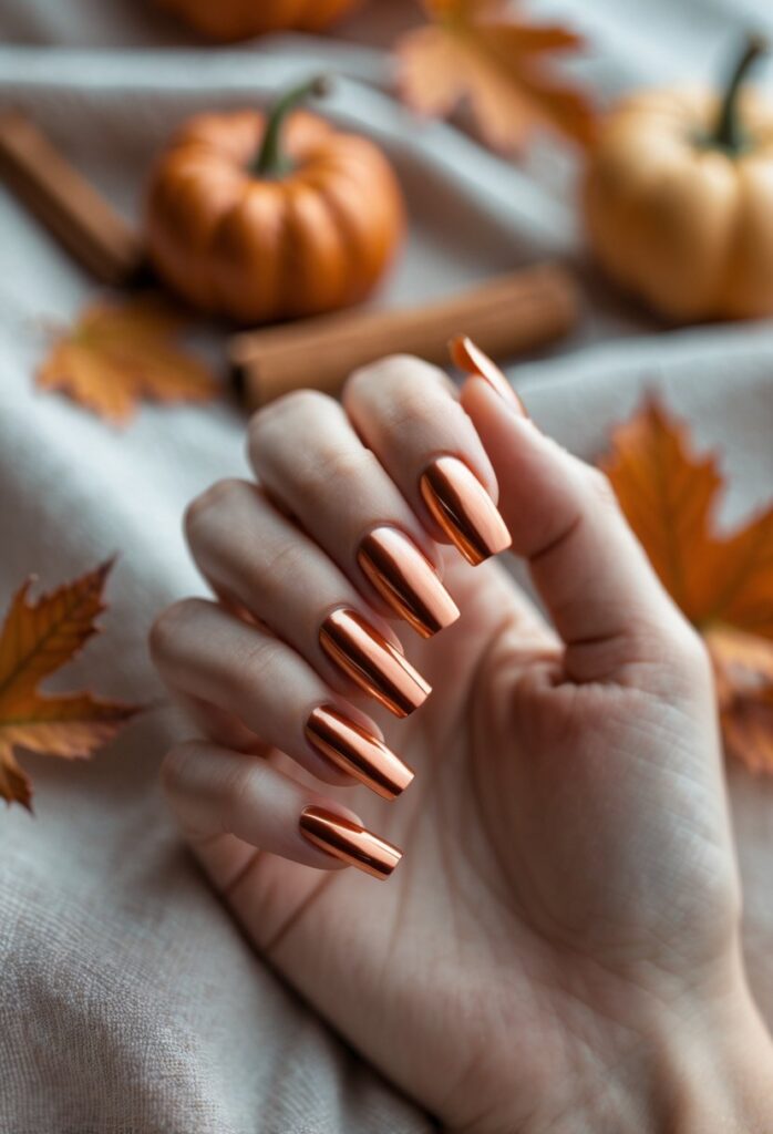 This manicure simply cannot be ignored! It has a completely metallic, mirror-like, copper-bronze tone. This “chrome” effect makes nails look like they’re made of liquid metal. Combined with its long, blunt shape, it creates a bold, futuristic, and incredibly stylish look. It’s the way to carry autumn colors in the most modern and striking way.