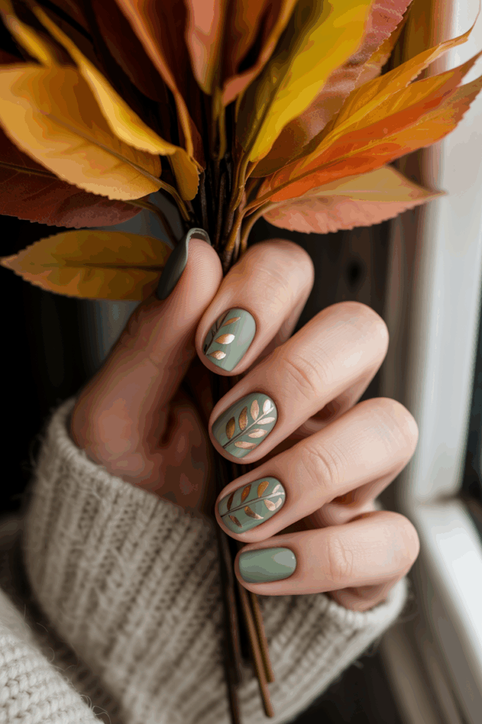I absolutely love this design! Shiny, metallic gold leaf patterns are etched onto a calm, matte olive or sage green base. It’s one of those rare looks where contrasts are so elegant. The matte finish gives the manicure a soft, velvety feel, and the gold details add a touch of luxury. It’s natural, elegant, and very chic.
