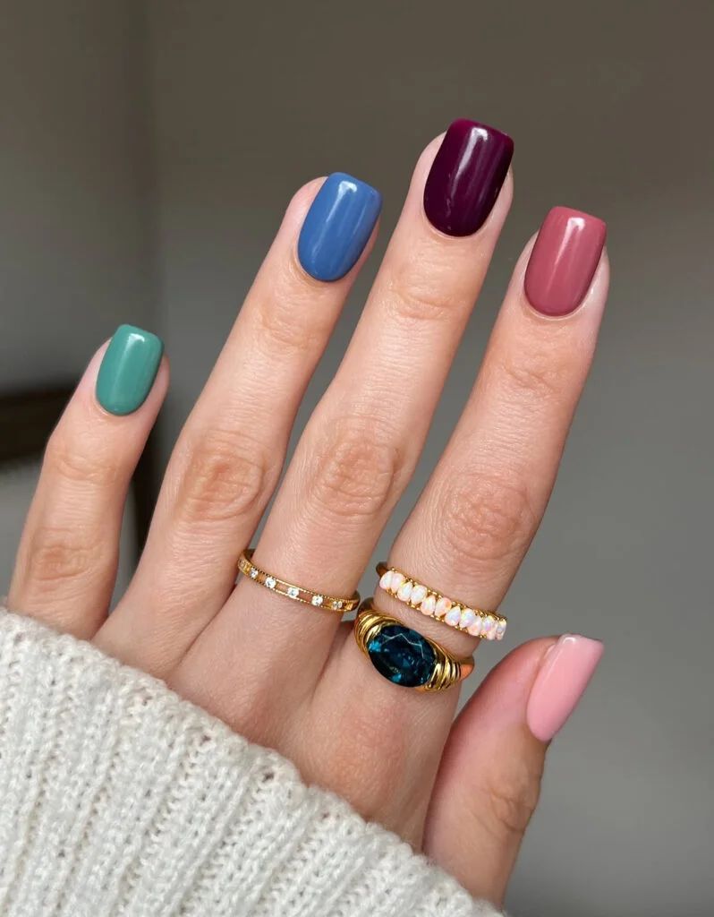 Who said that autumn is only for coffee and burgundy? This “Skittles” manicure, where each nail is a different color, breaks away from the typical fall color palette. Dusty blue, deep plum, rose pink, mint green, and pale pink come together in perfect harmony. The harmony of these seemingly unrelated colors is surprisingly successful and fun. It’s a high-energy choice!