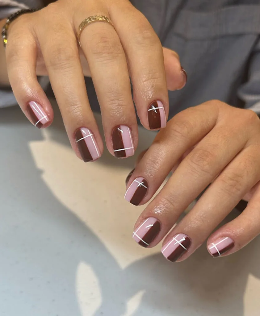 Modern, minimalist, and chic! The contrasting yet harmonious combination of dark brown and pale pink… The addition of thin, crisp white lines gives the design an instant geometric and “preppy” (college-inspired) feel. It’s the perfect example of how elegant and eye-catching nails can look, even on short ones. It’s ideal for everyday wear.
