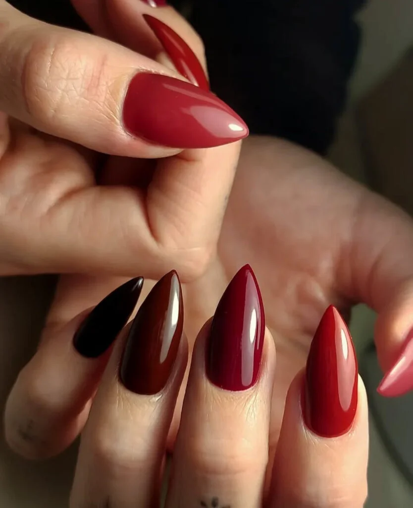 Why limit yourself to just one shade of red? This gradient manicure boldly transitions from the brightest, most vibrant shade of red to its deepest, nearly black form. When combined with long, sharp stiletto or almond nail shapes, it creates an incredibly bold, vampy, and alluring look. It’s guaranteed to instantly draw all eyes!
