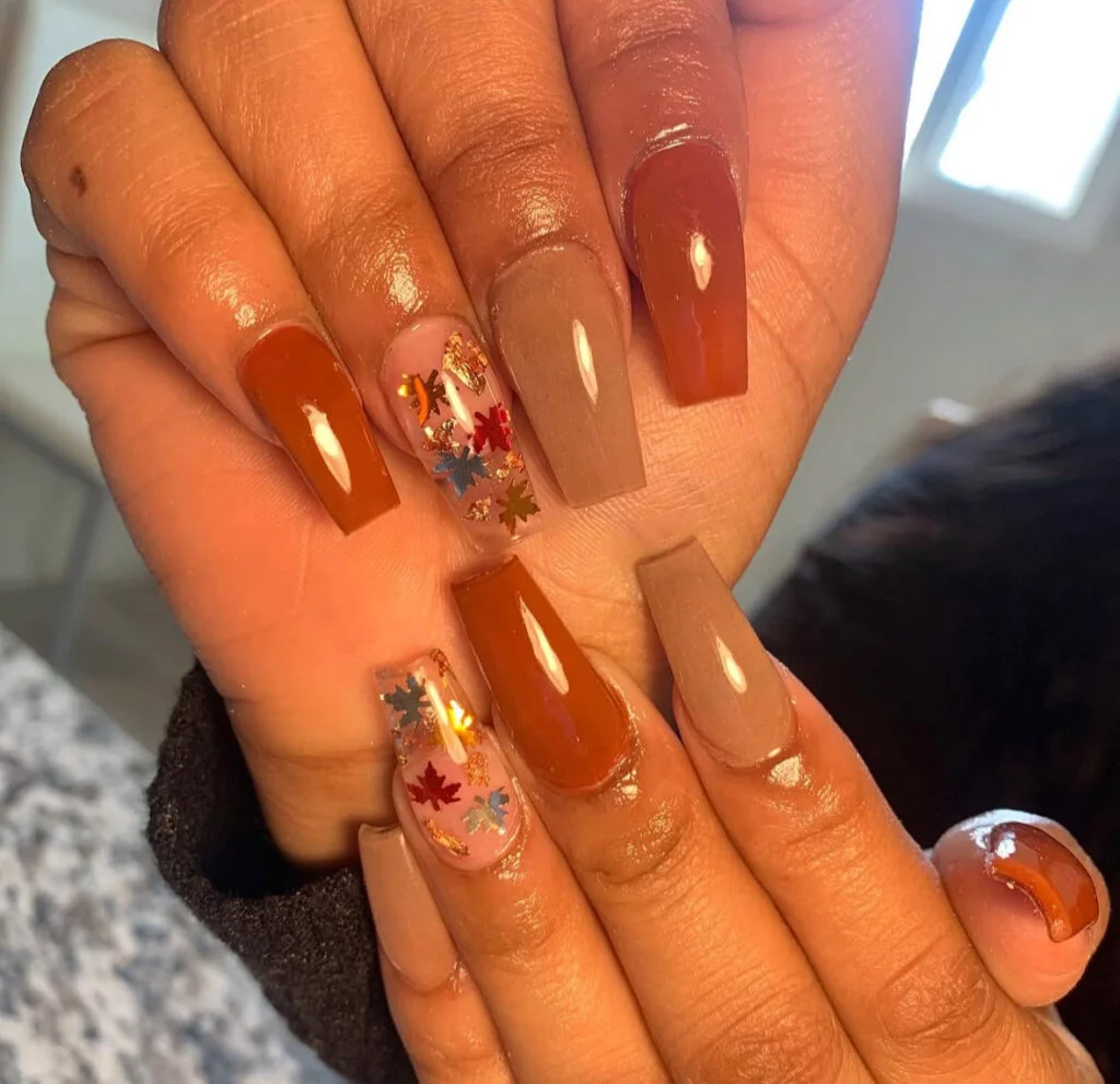 This is a fantastic design for those who want to fully embrace the autumn theme! The warmth of the burnt orange and beige tones is enhanced by the stunning detail on the accent nails. Colorful maple leaves and golden sparkles scattered on a transparent base create a miniature autumn scene. Coffin-shaped nails complete this bold design.