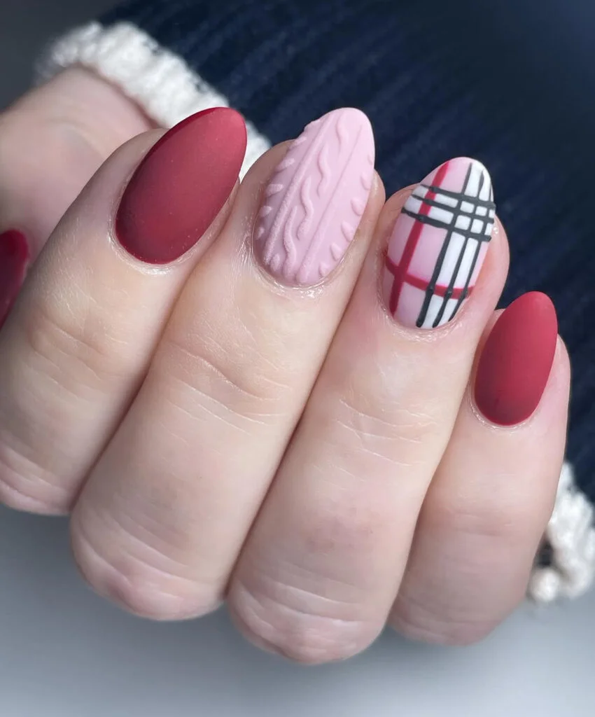 Here’s a design that will bring a warm, cozy winter feeling to your nails! The matte texture is key to achieving this look. The elegance of matte red, combined with the 3D “sweater pattern” texture on the pink nail, creates an incredibly cute, warm look. The plaid pattern on the other nails perfectly completes the winter theme. It’s a wonderful concept that evokes a tactile sensation!